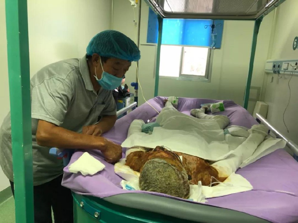 9月19日上午,记者在贵阳市烧伤医院的ICU病房见到张凯时,他全身上下几乎没有一块完好的皮肤。据张凯家人介绍,他体表的烧伤面积高达89%,同时还伴有吸入性损伤,可以说是好不容易捡回了一条命。