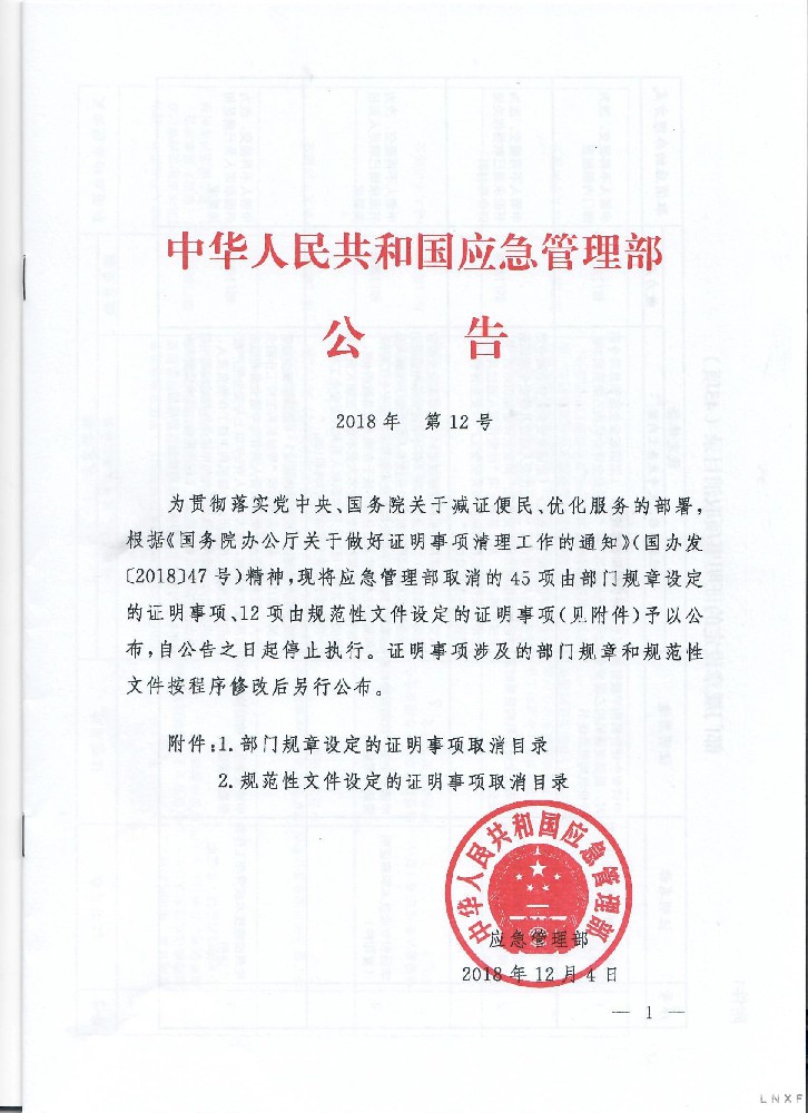 为贯彻落实党中央、国务院关于减证便民、优化服务的部署,根据《国务院办公厅关于做好证明事项清理工作的通知》(国办发〔2018〕47号)精神,现将应急管理部取消的45项由部门规章设定的证明事项、12项由规范性文件设定的证明事项(见附件)予以公布,自公告之日起停止执行。证明事项涉及的部门规章和规范性文件按程序修改后另行公布。附件1:W020181207362870375369.pdf附件2:W020181207362870383175.pdf