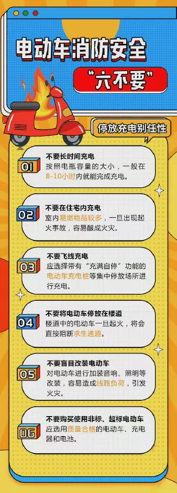 电动车在充电时,不在客厅或楼梯间、走道内充电,在其他地方充电时要仔细检查并清理附近堆放的易燃可燃物品,以防电动车在起火时引燃附近的物品,造成更大的火灾。